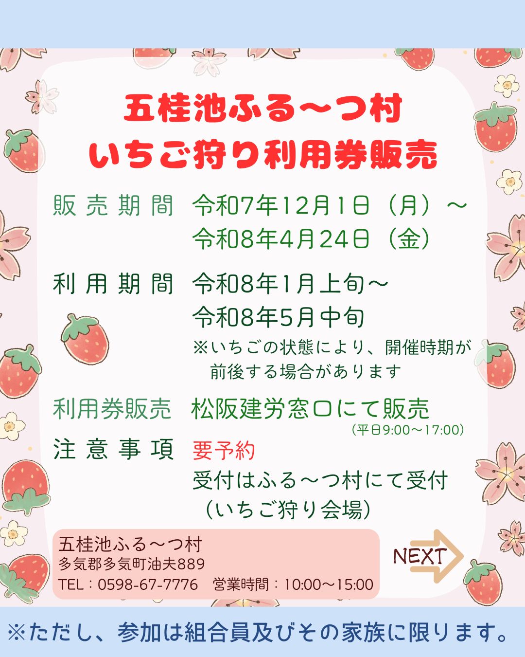 多気郡多気町の五桂ふる∼つ村のいちご狩りが楽しめる利用券を組合員限定価格で販売いたします。