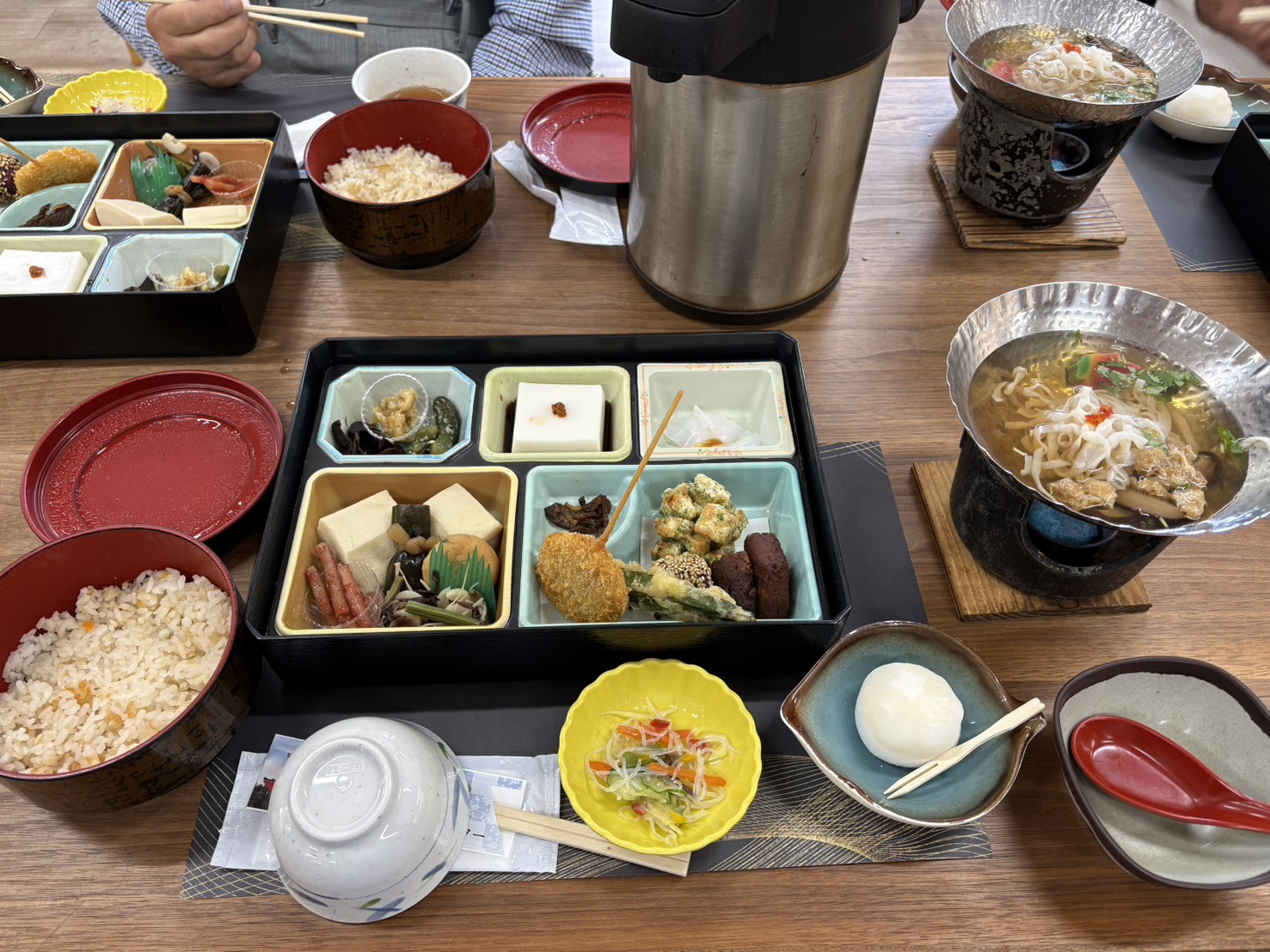 高野山到着後は、精進懐石の昼食をいただきました。大豆のお肉や刺身こんにゃく、精進麺鍋など、お肉を使わず工夫された味付けで、とても美味しくいただきました。